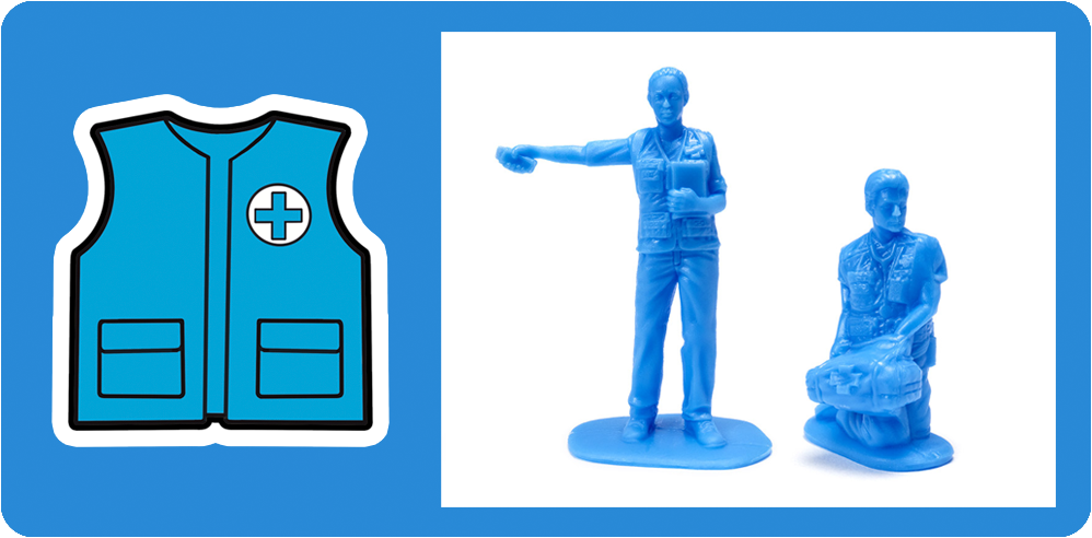 تتضمن معظم مجموعات الألعاب ما يلي: 2 المنقذ الميداني في الخطّ الأمامي، و2 الصّحفي المصوّر لأحداث الحرب ، و2 العامل الإغاثي العامل الإغاثي (عشوائيًا)