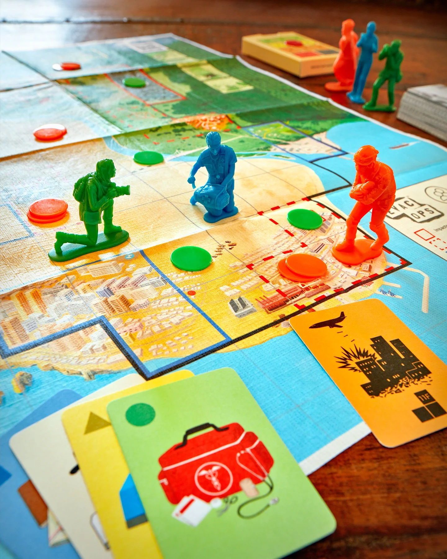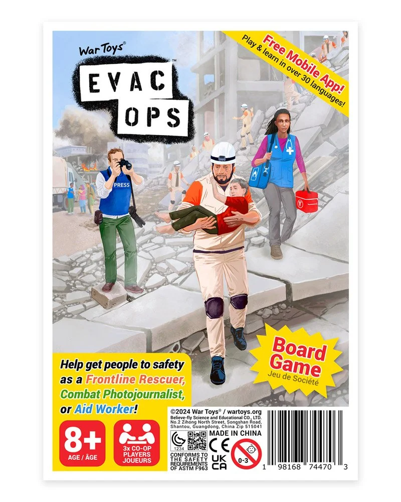 تتألّف لعبة ™War Toys: Evac Ops اللّوحيّة من ثلاثة لاعبين هم: المنقذ الميداني في الخطّ الأمامي، و الصّحفي المصوّر لأحداث الحرب، و العامل الإغاثي. يجب عليكم العمل معًا بسرعة، واستخدام مهاراتكم الخاصّة لإنفاذ المدنيّين من مناطق الخطر قبل أن تخسروا الموارد، أو الوقت، أو الحظّ!